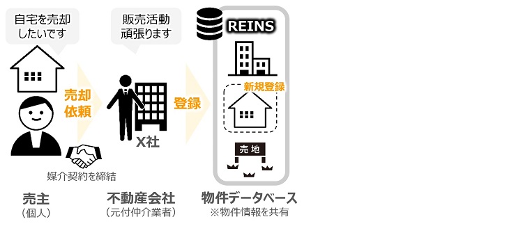 ①売主から売却依頼を受けた不動産屋がREINSに物件を登録する